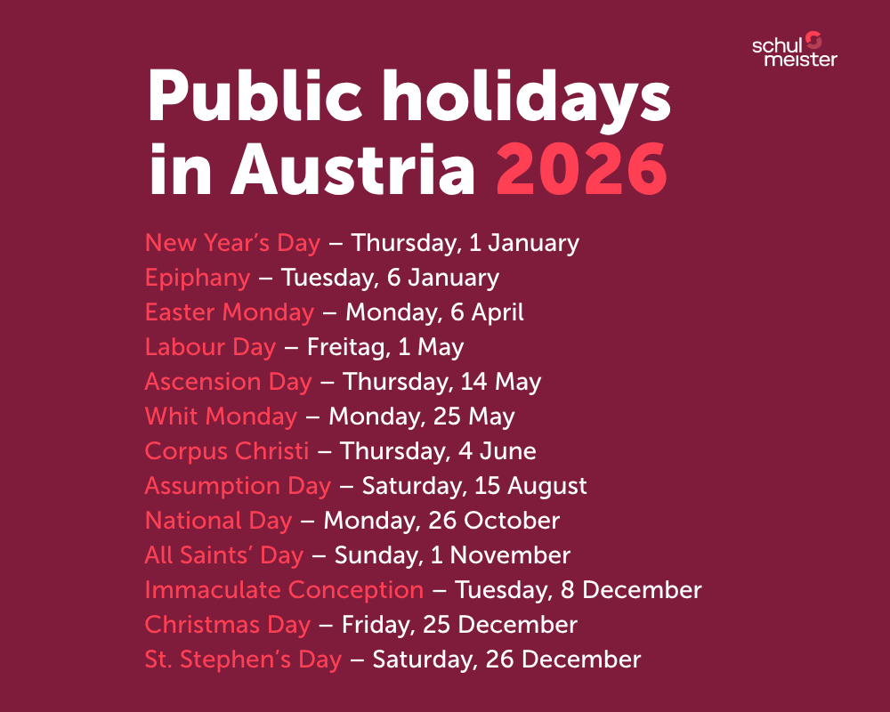 Before you enter your holiday dates, it is worth taking a look at the public holidays for the upcoming year. Austria has thirteen public holidays, which can vary depending on the federal state. Many dates fall conveniently on a Monday or Thursday, opening up perfect opportunities for long weekends. The graphic on the right provides an overview of all nationwide public holidays.